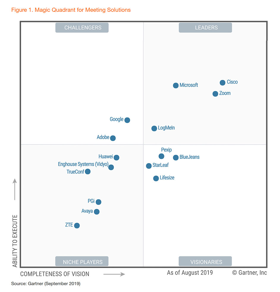 CISCO는 네트워크 장비관련된 회사로 많이 알고 있는데 이런 화상회의 솔루션도 가지고 있었네요. ZOOM은 좀 낮설은 이름인데 가트너 2019 매직 쿼드런트에서 회의 솔루션 부문 리더에 당당히 상위권에 있는 것을 볼 수 있습니다.